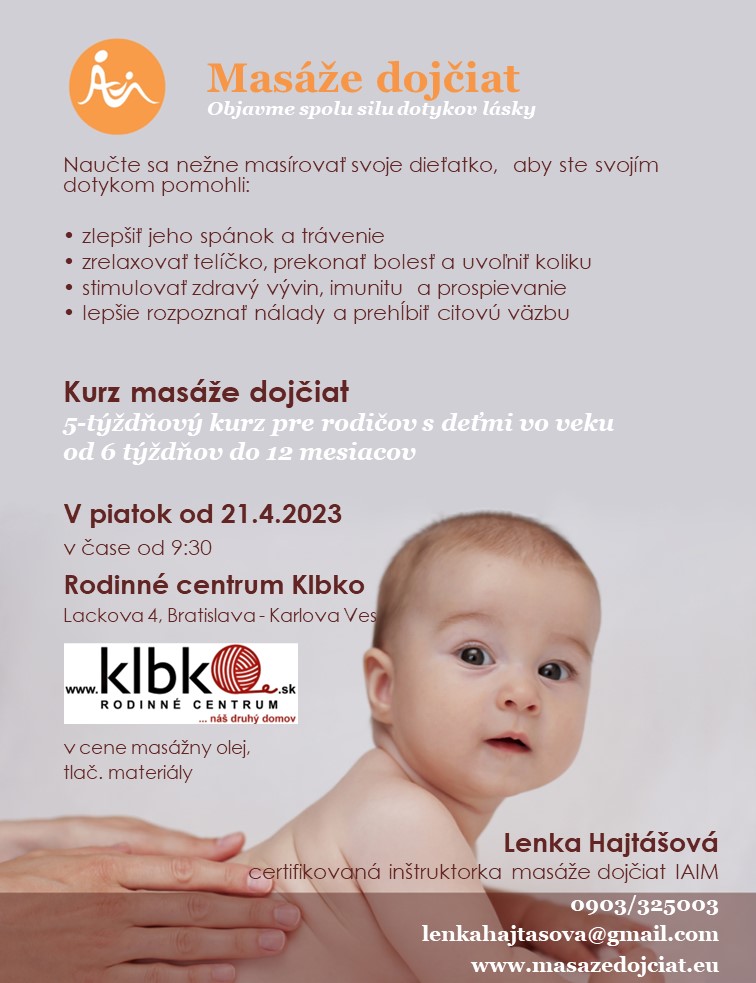 Naučíte sa masáž celého telíčka, ktorá pozostávaz prvkov švédskej a indickej masáže, jogy a reflexnej terapie, masáž bruška pre bábätká s boľavým bruškom a koordinačné cviky na podporu pohybového vývinu. Na stretnutiach sa okrem hmatov naučíte, ako lepšie porozumieť plaču, signálom dieťatka a ako s ním komunikovať, aby sa cítilo sebaisto a bezpečne. Aby ste mohli s masážou pokračovať aj v staršom veku, naučíte sa aj rôzne adaptačné techniky