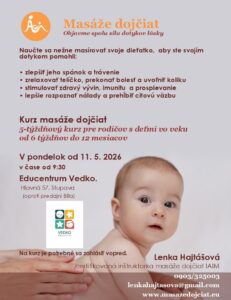 ♥Mamičky♥ venujte dieťatku dotyky cez masáže. Možno vo vás zarezonuje tato ponuka Naučíte sa, masáž celého telíčka, ktorá pozostáva z prvkov švédskej a indickej masáže, jogy a reflexnej terapie, ●masáž bruška pre bábätká s boľavým bruškom ● koordinačné cviky na podporu pohybového vývinu. Na stretnutiach sa okrem hmatov naučíte, ●ako lepšie porozumieť plaču, signálom dieťatka a ako s ním komunikovať, aby sa cítilo sebaisto a bezpečne. Aby ste mohli s masážou pokračovať aj v staršom veku, naučíte sa aj rôzne adaptačné techniky Masáž bábätku pomáha napĺňať takmer všetky potreby v jednom momente. Akýkoľvek dotyk v dobrej vôli je zázrak samotný a má nesmiernu moc, ktorú si často ani neuvedomujeme. Pri masáži je však o to účinnejší a mocnejší, že je uvedomelý a cielený, so 100% zameranou pozornosťou. Masáž podporuje ♥CITOVÚ VÄZBU ♥IMUNITNÝ SYSTÉM ♥LAKTÁCIU A DOJČENIE ♥ TRÁVENIE A PRIBERANIE NA VÁHE ♥KVALITU SPÁNKU A UVOĽNENIE STRESU ♥VÝVIN MOZGU A DOZRIEVANIE NERVOVEJ SÚSTAVY ♥UVOĽNENIE TELÍČKA A NAVODENIE POCITOV ŠŤASTIA ♥♥ZMIERŇOVANIE POPÔRODNEJ DEPRESIE A REGENERÁCIU PO PÔRODE V centre Vedko v Stupave 11.05. Pondelok o 9.30 cena 90€ Ponúkame vám možnosť , vybrať si aj kurz v domácom prostredí, v malej skupine alebo individualne stretnutie v našich priestoroch . Je možnosť kurz darovať ako darček. Akýkoľvek dotyk z dobrej vôle je zázrak samotný a má nesmiernu moc Rezervácia miesta potrebná
